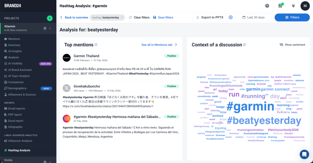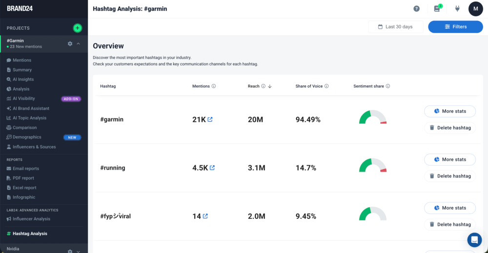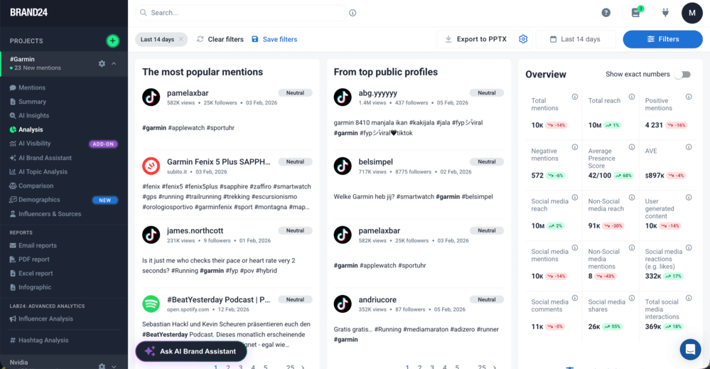 برند24، از سوی دیگر، رویکرد گسترده تری را اتخاذ می کند. این ابزار به جای ایجاد گزارش، به ردیابی هشتگ در زمان واقعی ادامه میدهد، امکان تجزیه و تحلیل احساسات را فراهم میکند، افزایش استفاده از هشتگ را تشخیص میدهد و زمانی که اتفاقی غیرعادی رخ میدهد هشدار ارسال میکند.