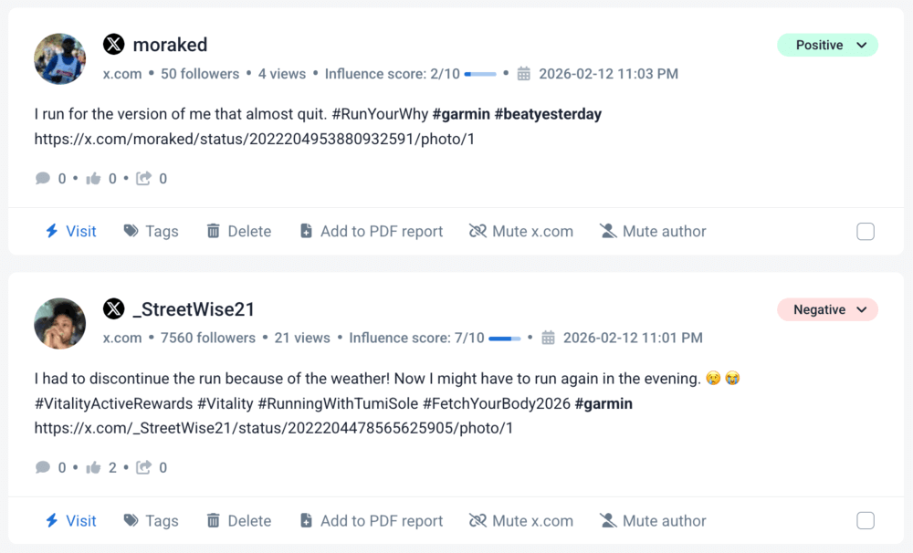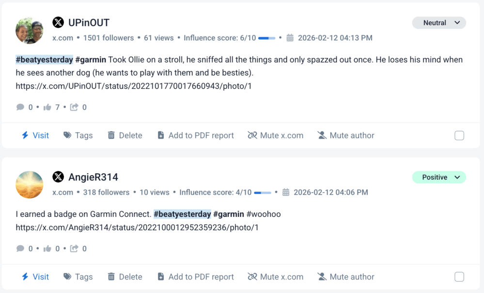 به عنوان مثال در گارمین #دیروز را بزن هشتگ در X (توئیتر) توسط افراد برای به اشتراک گذاشتن داستان های شخصی پیشرفت تناسب اندام استفاده می شود. با ردیابی این هشتگ، گارمین می تواند حجم، میزان دسترسی، تعامل و مشارکت جامعه در آن کانال را اندازه گیری کند.